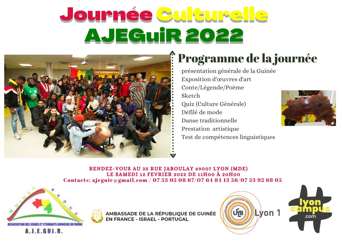 Comme chaque année AJEGuiR organise une journée culturelle qui réunit tous les étudiants de la ville de Lyon. Cette journée culturelle vise à promouvoir la culture africaine et guinéenne en particulier. AJEGuiR vous invite à venir parager cette journée de joie le 12 février 2022 à partir de 14h au 25 rue Jaboulay 69007.